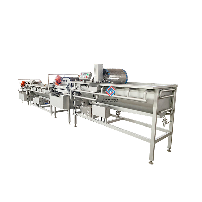 2.切割蔬菜使用到清洁机可以将材料均匀的进行分散,螺旋的水流可以将物料和杂质进行分离,物料随水流出不会损坏物料的表面,后端采用了振动传递的方式并进行二次喷水,以此来提高清洁的程度,配备的臭氧装置可以用于一次性清洁,并杀灭等农药残留,冰水装置可以用于二次清洁,用来降低物料的温度达到延长存储的时间。