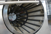 由电机带动中间轴上的链轮旋转从而带动滚筒的旋转,滚筒上有三个大法兰,由六个托轮支撑,滚筒速度可由电机作调整。滚筒内壁装有导料长条,滚筒内有喷淋水管,下方有两个水箱,进料方喷淋管的水来自出料边水箱,此水采用循环水;出料处的喷淋水来自进料边的水箱,此水是清水。